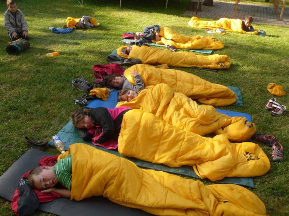 Postele jsou s froté prostěradly, povlečenými polštářky a dekami s krepovým povlečením. Spacáky tedy nepotřebujete. Při aktivitě "spaní pod širákem" můžete využít spacák a karimatku oddílovou, které na táboře k tomu účelu máme.